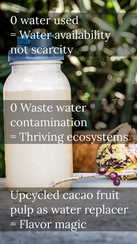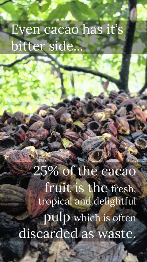 Cacao is a fruit just like coffee. It grows from a tree called Theobrama Cacao "Cacao the food of the goods". Yes, can you imagine it? The food of the goods, more specifically, the pulp from the cacao fruit, for centuries, has been flowing into the ground like waste. Outrageous, right?. We are sparking a revolution to end this wasteful mentality and reality. The chocolate industry is solely interested in the beans. but, funny enough, the beans are not always properly fermented and we believe they could have a greater quality if they were de-pulped. Yes, we just gave you the happy secret to happier and more effective cacao fermentation. You can learn a lot from coffee if you just let us come in and help you out! Lastly, you're throwing away farmers' income. By using the caca fruit pulp in a co-fermentation innovation, coffee tastes better whilst giving cocoa farmers and (seasonal) workers an additional income. And, coffee farmers are given an alternative to washed coffee processing, as they need no water to process the coffee as it is replaced by the cacao fruit pulp and stops the headache of post processing water treatment to prevent waste water contamination flowing into nature. Everyone wins!